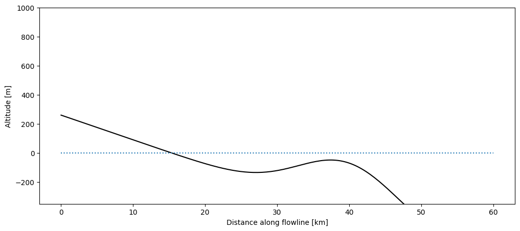 plt.ylim(-350, 1000); plt.ylabel('Altitude [m]'); plt.xlabel('Distance along flowline [km]');