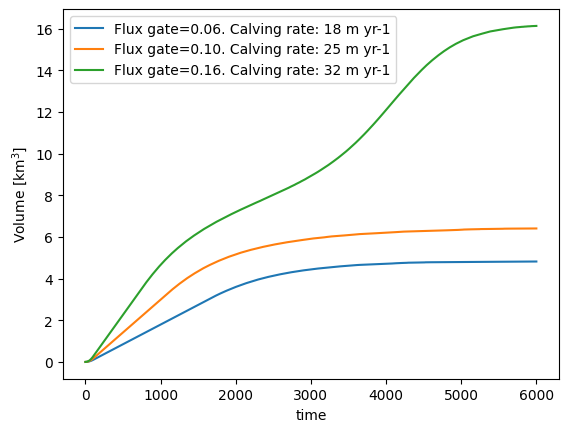 key = 'Flux gate={:.02f}. Calving rate: {:.0f} m yr-1'.format(flux_gate, model.calving_rate_myr)